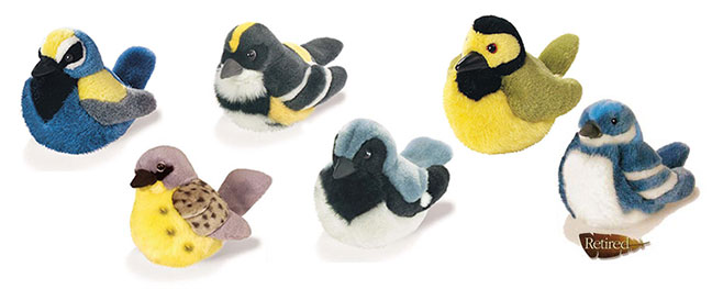 These little plush birds are 5 to 6 inches long and sing their own particular song when squeezed. They are made by Wild Republic in partnership with the Audubon Society. The bird sound recordings are made by the Cornell Lab of Ornithology.
