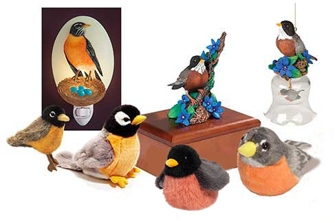 These American Robin plush toys and gifts can be found at our sponsor's online gift shop. We have the Ibis and Orchid Robin Night Light, Wild Republic Robin Audubon Bird with sound, Robin Trinket Box, Robin Bell, Folkmanis Robin Finger Puppet, Cabin Critters Robin and Douglas Melody the Robin. Find these Robin Gifts in the Jeannie's Cottage online gift shop.This largest of North American thrushes is one of the most familiar songbirds in the eastern United States. Thrushes are members of the Turdidae family. They form a group of about 300 species, which are found worldwide, and share several traits, including the fused scutes or scales at the rear of the legs and the spotted plumage of the young. These are large-eyed, slender billed, stout-legged songbirds. They are among the finest of singers.