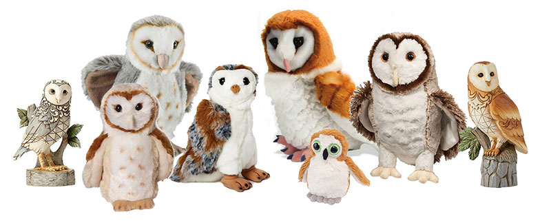 The image at top shows a group of plush toy Barn Owl stuffed animals. They are a WOWs Barn Owl with glow in the dark eyes, a plush toy Wildlife Artists Barn Owl, a Cuddlekins Barn Owl from Wild Republic, a Cabin Critters Barn Owl, a Jim Shore Barn Owl figurine and Swoop and Rafter the Barn Owls from Douglas. Find these plush toy Barn Owl stuffed animals and gifts at our sponsor's online gift shop.
