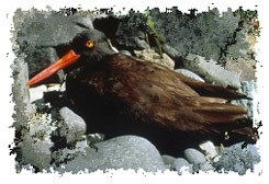 These are large 17-inch shorebirds. Found on coastal mudflats and rocky coasts, they feed on shellfish. These birds group in small flocks and keep apart from other shorebirds. The plumage is all black with a long red bill and pale legs. The voice is a sharp piercing whistle.