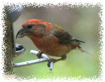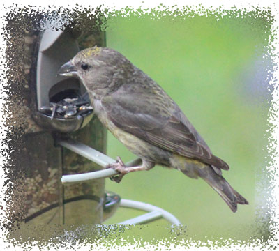 The sharp tips of the jaws cross and overlap. This is an adaptation for opening the cones of evergreens to secure the little seeds beneath the scales. While doing this, crossbills hold the cones in their feet, parrot-wise, and twist off the scales rapidly and efficiently with their unique bill. Because of its dependence on pine seeds, the Red Crossbill is an erratic and nomadic species. When the cone supply fails, these birds gather in flocks and may wander far from their normal haunts. They may breed almost anywhere, and at any season, so long as the food supply is adequate. And as these pictures indicate, they will frequent bird feeders.