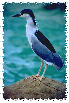 The Black-crowned Night Heron is a medium-sized heron, 20 inches long with a 44-inch wingspan. It has a stocky build, short legs and a short neck. The wings are blue gray, and it has a black crown and back, white face, neck, chest and belly. Two long white plumes decorate the back of the head during breeding season. The eyes are red and the legs are yellow. The juveniles have yellow eyes and are heavily streaked with brown and white. The wings are brown with white spots. Full adult plumage is reached by the third year. The juvenile yellow-crowned night heron is very similar to the black-crowned but has a thicker bill and longer legs.