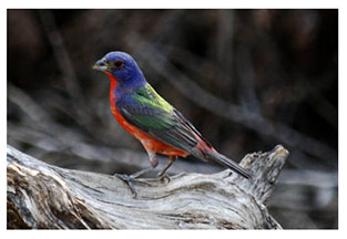 This beautiful colorful bird is a Painted Bunting (Passerina ciris). It is sparrow sized (5-1/2 inches). The female is green above and yellowish below. The song is a series of high-pitched musical notes. It inhabits thickets, briar patches and woodland edges. Its diet is seeds and insects.