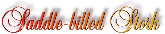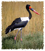 One of the tallest species of storks is the Saddle-billed Stork, Ephippiorhynchus senegalensis, which stands up to 58 in. high. It has a large crimson bill with a black band and a triangular yellow frontal shield (or saddle), and has black legs with reddish joints. The overall coloring is black and white--the head, neck, tail and wing-coverts black, the remaining plumage and the flight feathers white. It breeds in sub-Saharan Africa, generally by rivers. The large nest is built of sticks in the tops of tall trees. It lays one egg. It feeds on grasshoppers, fish, frogs and lizards.