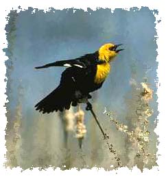 This handsome 9-inch blackbird is unmistakable with his bright yellow head and breast, black body and white wing patch. The female is charcoal brown and lacks the wing patch.