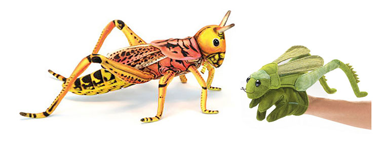 This Grasshopper Hand Puppet is made by Folkmanis and the yellow grasshopper is made by Hansa. Check our sponsor's online gift shop to see if we have these in stock.