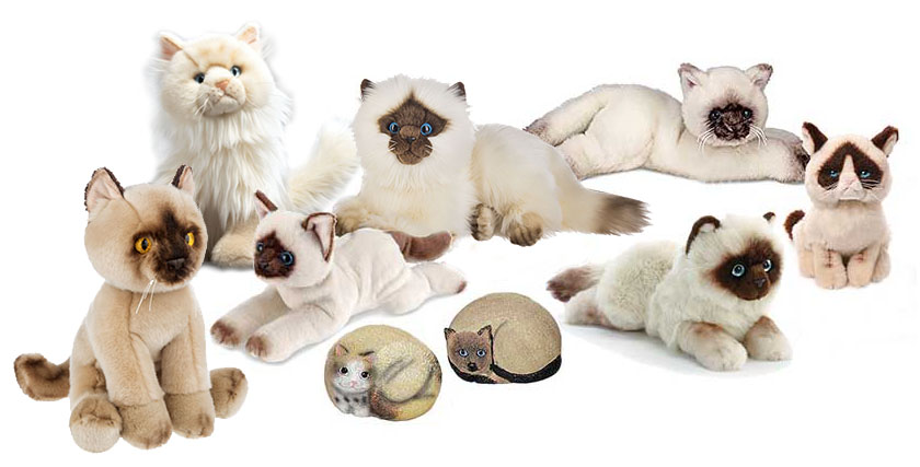 The above image shows a selection of plush toy Siamese, Bermese and Ragamuffin cats and gifts. They include a Ganz Heritage Collection Siamese Cat, Bermese Cat and Ragamuffin Cat stuffed animal, Cleo and Lil Cleo the Siamese Cats from Bearington, Grumpy Cat from Gund, and some Siamese Garden Stone cats. There is also a Demdaco Siamese Cat. Some of these cat stuffed animals can be found at our sponsor's online gift shop: Jeannie's Cottage LLC.
