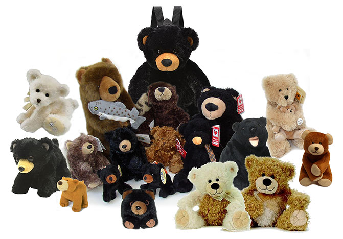 We have black bear plush stuffed animals in many styles. The image above shows a Black Bear Backpack from Unipak, a Brown Bear from Manhattan Toy Critterology Series, a Brown Bear plush keychain from the Stuffed Animal House, Bronson the plush Black Bear from Ganz, Buffy the Bear and Friend from Boyds, Catcher the Big Brown Bear from Jaag (holding a fish), Honeyfitz the Bear from Russ, Hug'ems Black Bear from Wild Republic, Sugar Bear from Ganz, and little Black Bear Key Clip from Wildlife Artists. There is also a Brown Bear Magnet, a Shining Stars Cream Bear and a Black Bear and Grizzly Bear from Wildlife Artists. You can find some of these bear stuffed animals in our sponsor's Gift Shop.