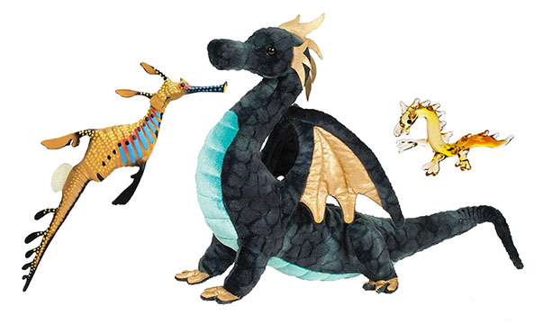 These Dragons are made by Douglas Cuddle Toys, Ganz and Safari. They include Aragon from Douglas; and a tiny glass golden dragon from Ganz. There is also a Safari Sea Dragon. They vary in size from approximately 16 inches long to less than an inch. Our sponsor, Jeannie's Cottage LLC has some of these available in their online Gift Shop.