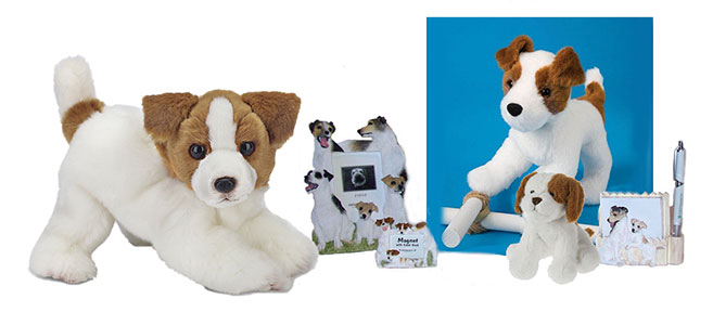carries some very nice gifts for the Jack Russell Terrier owner. The gifts shown in the photo are, from left, Jack the Jack Russell from Bearington, a resin frame, a resin magnet, Feisty the stuffed animal Jack Russell Terrier plush toy made by Douglas Cuddle Toys, and a Ganz Jack Russell Soft Spot stuffed animal. And at right is the resin note pad that comes with a little pen. It has a magnetic back for placing on a metal surface.