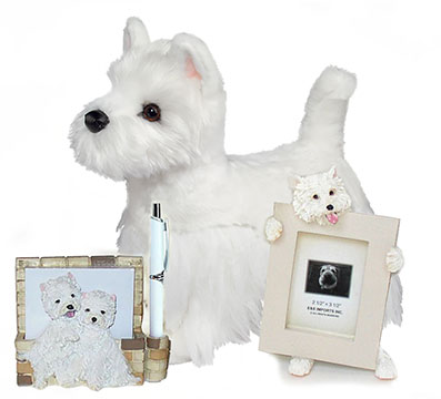 These stuffed animals and gifts are West Highland White Terriers or Westies. There is a Westie resin frame made by E& S Imports. The large Westie stuffed animal in back is from Douglas and is named Romeo. At left is a West Highland White Terrier figurine note pad. You can find some Westie gifts in th