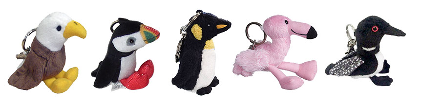 These plush toy bird keychains are made by the Stuffed Animal House. They make several styles including the bald eagle plush toy keychain, the Atlantic puffin plush toy keychain, the Emperor Penguin plush toy keychain, the pink flamingo plush toy keychain and the common loon plush toy keychain. These bird keychains are very soft, well made and are approximately 3.5 inches tall.