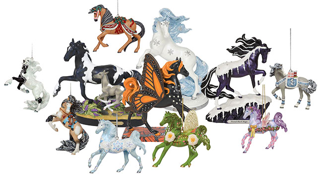 Each year a new series of horse figurines are introduced. The image above shows some of the designs: Monarch Beauty, Winter Wonderland, Forever Young and Frosted Black Magic. The ornaments shown here include Goddess of the Garden, Dance of the Sugarplum Ponies, and Lakota. Christmas Time in the City, Christmas Snow Princess, Tis the Season and Yuletide Chantilly Lace.