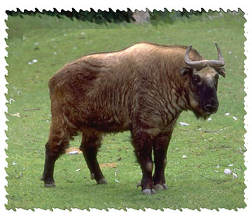 The Takin is a heavy, clumsy animal, with a shaggy coat of yellowish hair. It spends the daytime in the thickets of rhododendron and bamboo near timber line, leaving its shelter in the evening and early morning to graze on nearby grassy slopes. Breaking narrow trails through the bush,