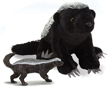 The little plush Honey Badger Cuddlekins stuffed animals are made by Wild Republic. The honey badger figurine is from Safari Ltd. You can find Honey Badger toys in our sponsor's online Gift Shop.