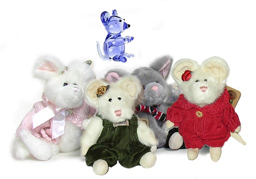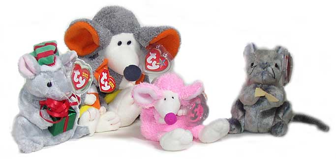 This little group of mice stuffed animals includes from left: Tiny Tim the Mouse Beanie Baby, Ratzo the Rat Beanie Buddy, Ratzo the Pink Rat and Cheddar the Mouse Beanie Baby. Check our sponsor's online Gift Shop to see if we have any plush toy mice.