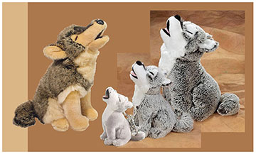 We have a Stuffed Animal House plush toy Howling Timber Wolf in two sizes as well as a Howling Wolf plush keychain, the tan howling wolf is made by Douglas. The black