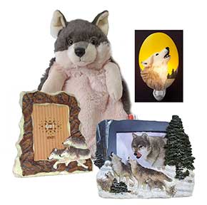 Here are some wolf frames, which are made by E&S Imports. There is also a Wild Republic wolf backpack and an Ibis and Orchid Wolf Night Light. Check our sponsor's online Gift Shop to see what is available.